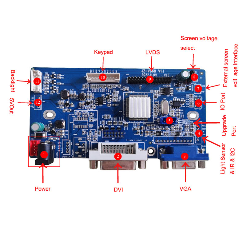 JZ-VD68 TFT LCD AD control driver board with VGA and DVI inputs Advanced display controller for industrial monitors, digital signage, and custom TFT LCD applications Supports high-resolution panels with precise AD control
