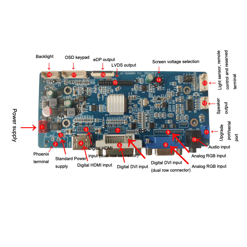 The JZ-VDH68WV is an industrial-grade driver board with serial port protocol control (UART RS232) It supports both LVDS and eDP output interfaces for precise management of digital signage, kiosks, and control panels